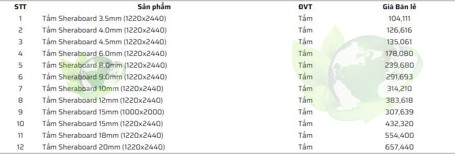 Bảng giá tấm Sheraboard chính hãng mới nhất 2025